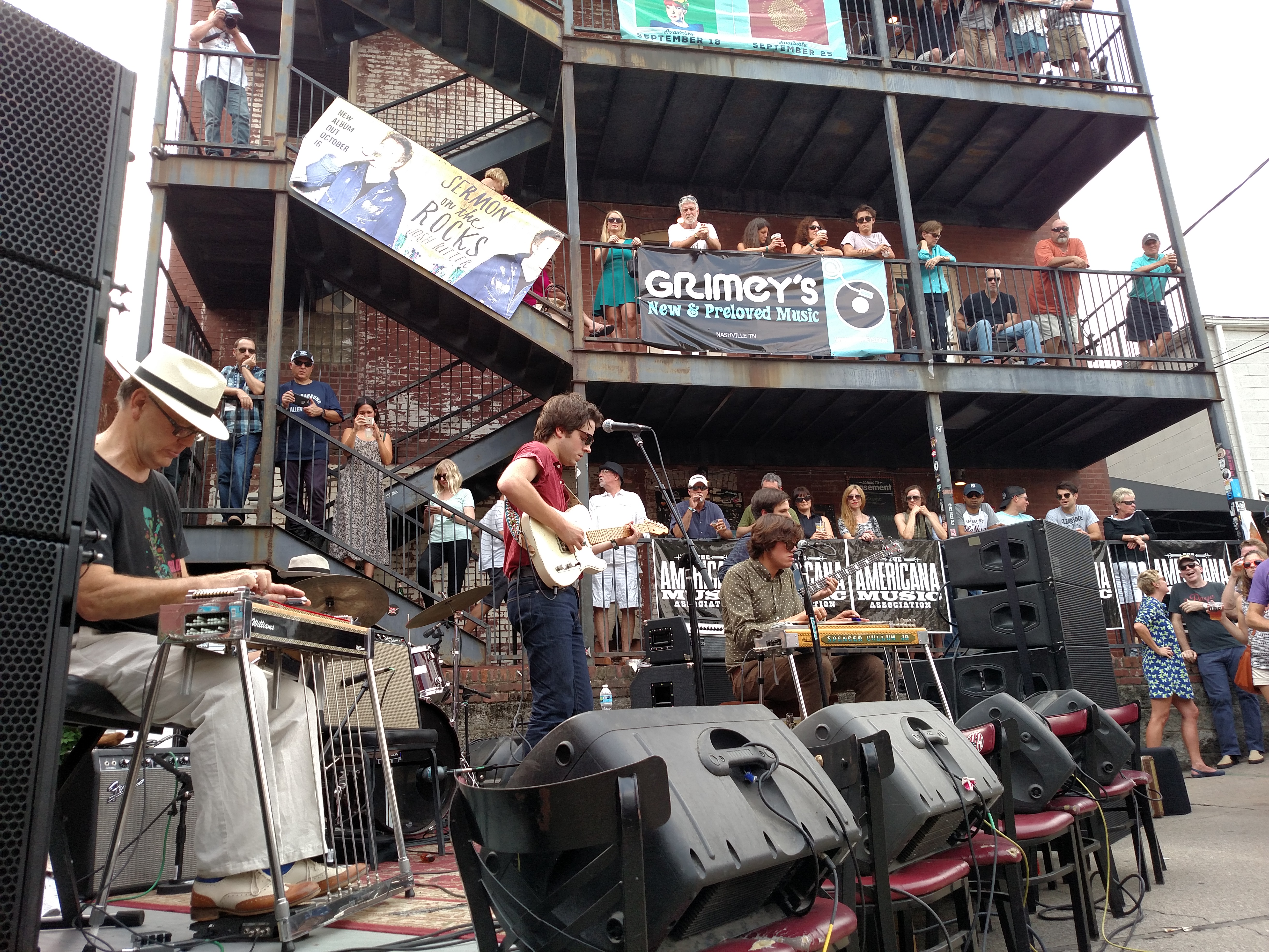 Thursday we visited Noshville for breakfast coffee before heading to Sirius XM studios for “America’s Most Wanted” featuring Warren Haynes, Ashley Monroe, Whitey Morgan, and Donnie Fritts with host Mojo Nixon. The small intimate setting with windows that look out onto Broadway and The Ryman is always one of the most sought after events to attend. From there we headed over to Jack’s BBQ for a little “meat & 3’s” lunch before heading back toward Southern Ground Studio for another great program by Rob Reinhart, host of the syndicated show Acoustic Café. Between the heat and the blasting going on across the street at the construction site, it was pretty tough to wait it out for Warren Haynes. Talking with Chris Sartin, the man behind Soulshine Pizza, helped us endure the wait. Joined by former Cadillac Sky fiddle player Ross Holmes, Haynes played several acoustic selections from his new album Ashes & Dust while talking about his musical career playing with The Allman Brothers and Gov’t Mule. One of many happy hours during this year’s festivities took us to the Douglas Corner Café to hear Calico The Band, Anne McCue and Rosie Flores. Dinner was a stroke of luck as we found a place called M.L. Rose Craft Beer & Burgers offering up 2 for 1 drafts on Little Harpeth Prost! Oktoberfest paired with their signature Night Owl burger. First showcase was catching another great songwriter Ryan Culwell who released Flatlands earlier this year. Hersh Cohen, the son of one of my closest friends and concert prank caller, is a recent graduate and multi-instrumentalist from Florida State University who moved to Nashville recently to follow his dream met up with us. After Culwell’s set, we all headed to 3rd & Lindsely for a gospel laced set by Ricky Skaggs, Ry Coder, and The Whites followed by an electric set from Buddy Miller, Marc Robot, and Fats Kaplin to close out our evening.